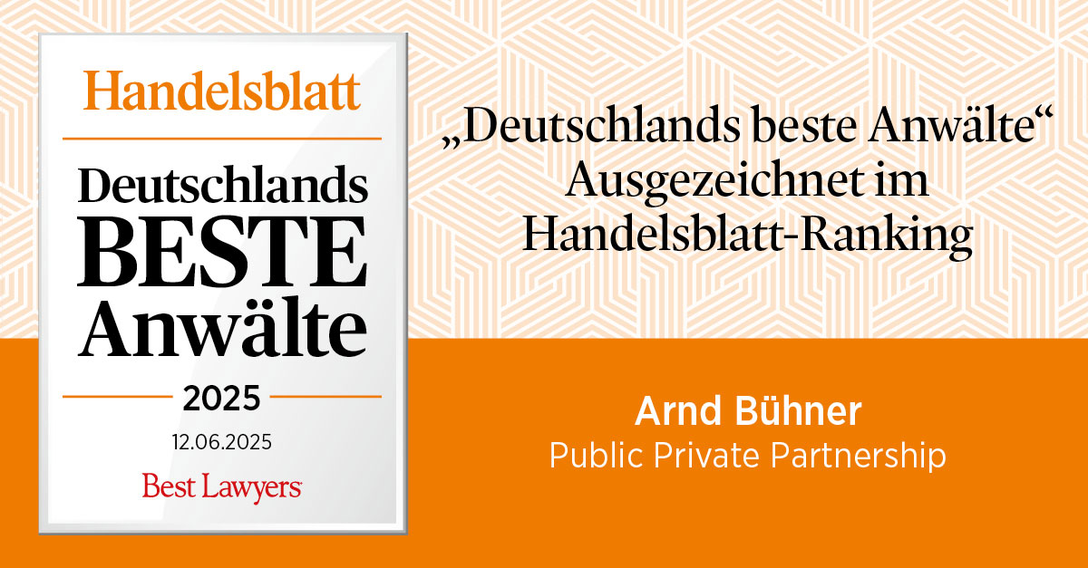 Zum sechsten Mal wurde Rechtsanwalt Arnd Bühner vom US-Verlag Best Lawyers als einer der besten Anwälte Deutschlands für den Bereich public private partnership ausgezeichnet.